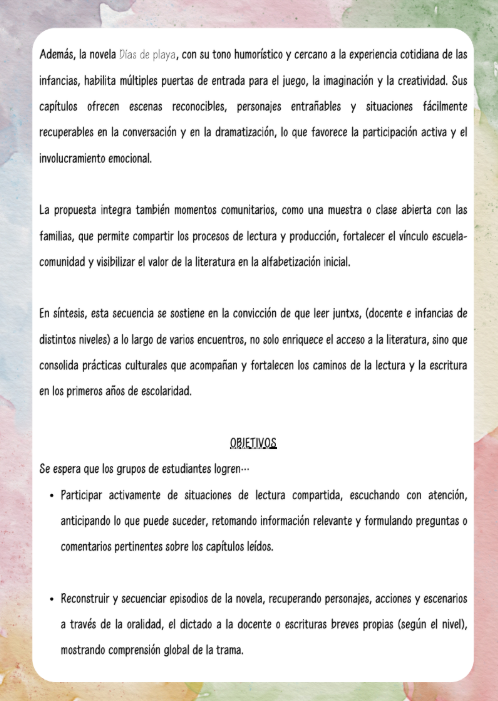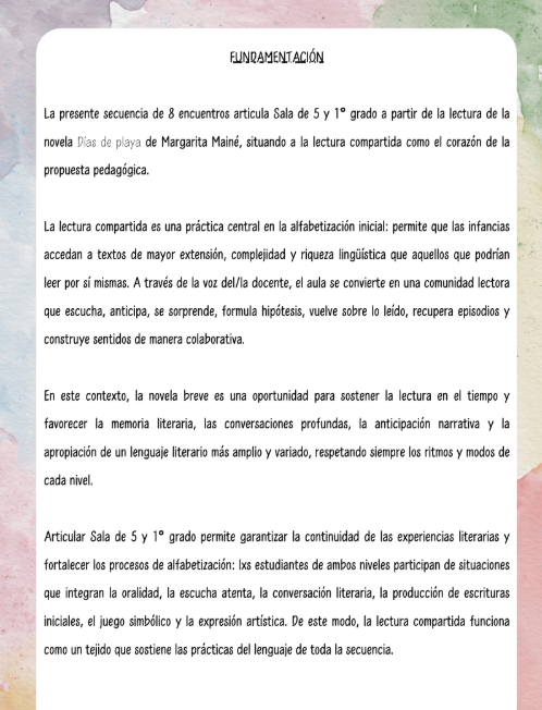 La presente secuencia de 8 encuentros articula Sala de 5 y 1° grado a partir de la lectura de la novela Días de playa de Margarita Mainé, situando a la lectura compartida como el corazón de la propuesta pedagógica.