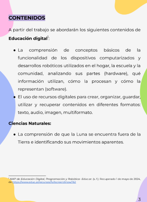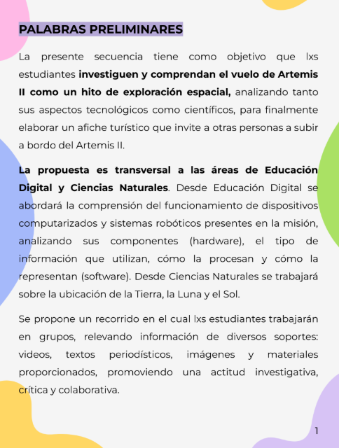 Secuencia didáctica en la que lxs estudiantes investigan la misión Artemis II como un hito de la exploración espacial, analizando sus aspectos científicos y tecnológicos. A lo largo del recorrido, trabajan en grupos con diversos materiales (videos, textos e imágenes) y, como producto final, elaboran un afiche turístico para invitar a viajar a bordo de la misión. La propuesta integra Educación Digital y Ciencias Naturales, promoviendo la comprensión de sistemas tecnológicos y la relación entre la Tierra, la Luna y el Sol, junto con el desarrollo de una mirada crítica, investigativa y colaborativa.