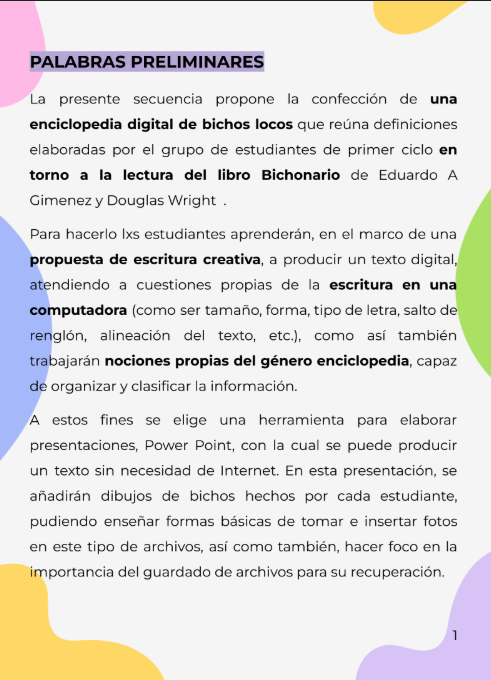 La presente secuencia propone la confección de una enciclopedia digital de bichos locos que reúna definiciones elaboradas por el grupo de estudiantes de primer ciclo en torno a la lectura del libro Bichonario de Eduardo A Gimenez y Douglas Wright. Lxs estudiantes aprenderán a producir un texto digital, atendiendo a cuestiones propias de la escritura en una computadora (como ser tamaño, forma, tipo de letra, salto de renglón, alineación del texto, etc.), como así también trabajarán nociones propias del género enciclopedia, capaz de organizar y clasificar la información.