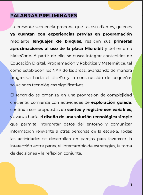 Una secuencia para que lxs estudiantes de SEGUNDO CICLO realicen sus primeras aproximaciones al uso de la placa Micro:bit y del entorno MakeCode. A partir de ello, se busca Integrar contenidos de Educación Digital, Programación y Robótica y Matemática, tal como establecen los NAP de las áreas, avanzando de manera progresiva hacia el diseño y la construcción de pequeñas soluciones tecnológicas significativas.