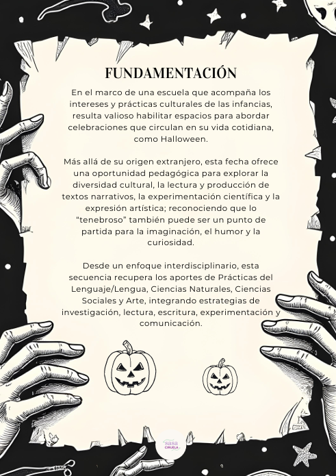 Este material propone una secuencia interdisciplinaria para abordar Halloween en la escuela desde una mirada pedagógica, cultural y creativa. A partir de lecturas, experimentos y producciones artísticas, se invita a los y las estudiantes a explorar los orígenes de esta celebración, conocer distintas tradiciones del mundo y animarse a crear sus propios cuentos de terror.