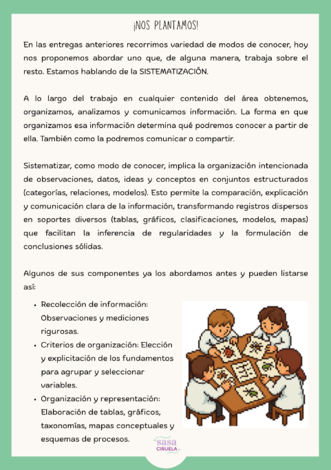 Dos propuestas, una para primer ciclo y otra para segundo. Este material se propone continuar y ampliar lo ya abordado del eje ”Seres Vivos” poniendo especial atención a la SISTEMATIZACIÓN como modo de conocer el mundo, haciendo foco en las PLANTAS.