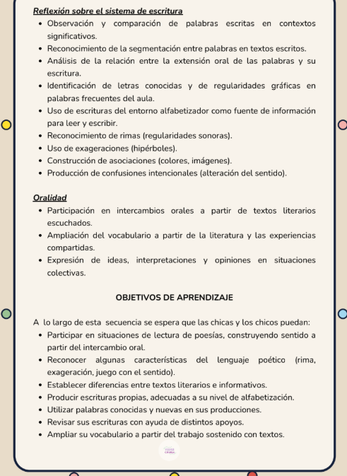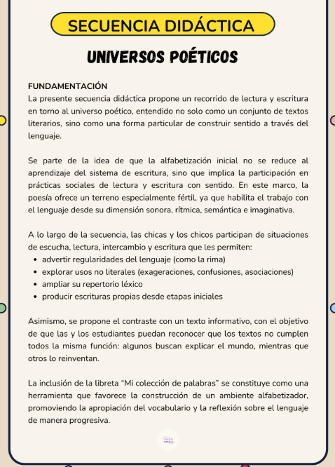 La secuencia Universos poéticos parte del trabajo con poesías. Se propone un recorrido por la lectura, la oralidad y la escritura que permite a las chicas y los chicos explorar el lenguaje desde el juego, la rima, las exageraciones y la imaginación, a la vez que construyen sentido y amplían su vocabulario.